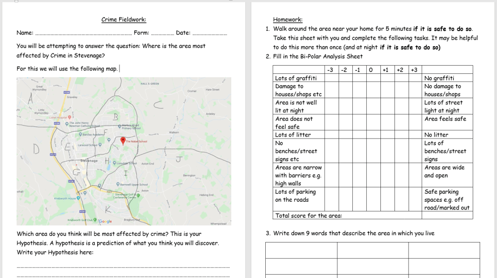 Another kind offering from Mr Breese (@BreeseGeography). A Word document that you can adjust for your local area to investigate evidence of crime. “[Used as part of a] crime SOW, also used some secondary data from police website to create another choropleth map.”