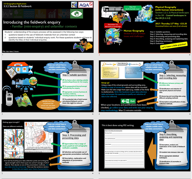 A 2-hour lesson I used to do with Year 10s which uses a mini investigation around the school site to help students practise the six fieldwork enquiry steps. Students investigate mobile phone signal strength around the school site. A Powerpoint guides students through the steps, and a Publisher file can be adapted e.g. swapping out a map of my old school’s site with yours.