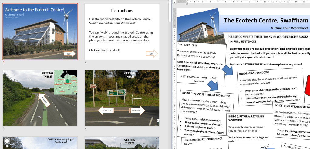 Another virtual field-trip I made for students who were unable to go on a Year 8 field trip to the Green Britain Centre (nee ‘Ecotech Centre’) in Swaffham, Norfolk. It enables students to see all kinds of example of sustainability through a self-guided virtual roam. Unfortunately, this is now the only way you can ‘visit’ the Green Britain Centre, as it shut down in 2018. Download the PowerPoint and worksheet (inc answers).