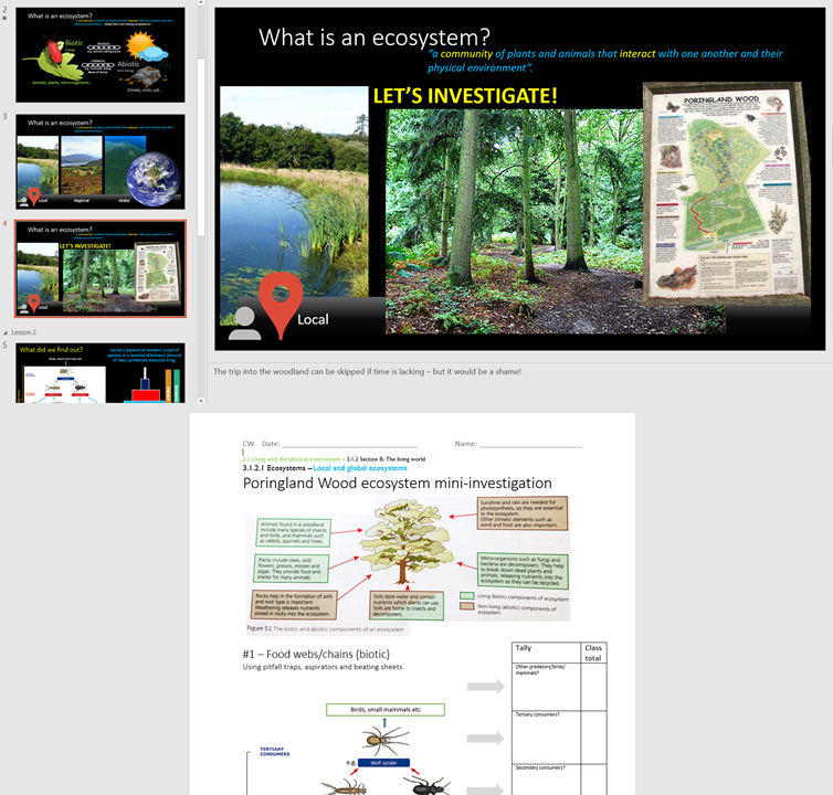 If you’re lucky to have a woodland right next to your school grounds, or one in the catchment area that students can easily access in their own time. We had a woodland surrounding a couple of sides of the school site, and so we took GCSE students during lesson time to use a mini-investigation to introduce AQA GCSE Geography’s Ecosystems unit. Download the PowerPoint, worksheet and teachers notes, and swap-in specifics to your school and location.