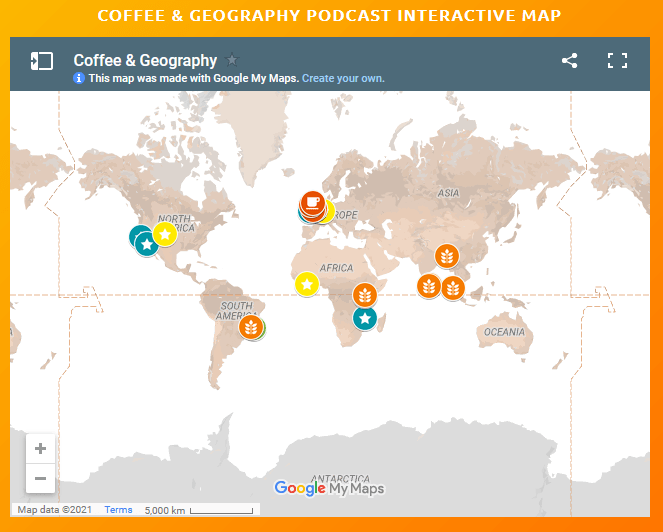 The podcast comes with a map of the ever-growing ‘Coffee & Geography’ podcast community. You can find geolocated information about our current, future and potential guests! Is your area not represented? Then consider getting involved!