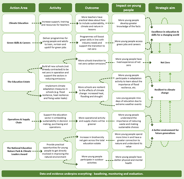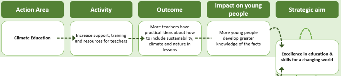 For ‘Evidence and Insight’, research and evidence-based practice is something that us educators are familiar with. Careers education is already measured by the likes of the Gatsby Benchmarks, progress measures towards a net-zero school or community can be made through financial and energy audits, building resilience through reviewing and reforming curriculums, and increasing access to nature as a way of improving to protective factors of student mental health, which can be measured in safeguarding reviews.