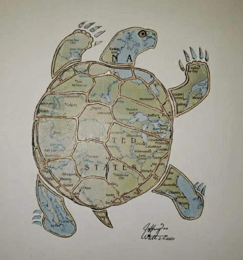 And then we came to Turtle Island. I had pulled up a map, and he described how, if you look just right you can see the outline of a turtle: the head in northern Canada, the front legs in Alaska and Quebec, the hind legs in Baja and Florida. The creation story, in which the turtle offers its back so that a new world can be formed.