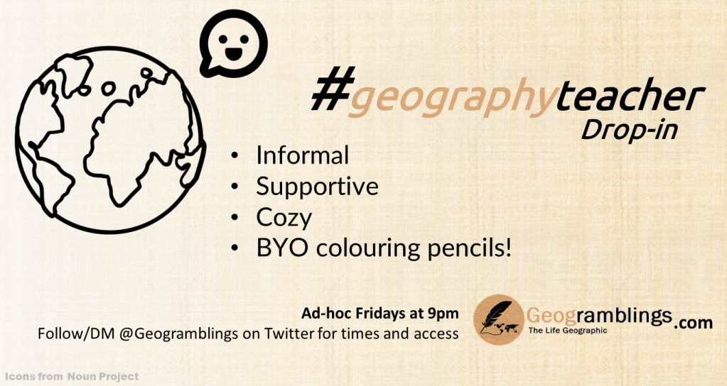 Occuring on Friday evenings at 9pm (UK time) on an ad-hoc ocassion. If you are a #geographyteacher (or any Geography-related subject š) from anywhere around the world, then drop-in for 40 mins of unstructured informal venting, small-talk and release! Wellies or hikers optional. š„¾
